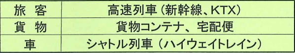 |   | 3-2.走行形式 - 実行可能な案 トンネルの中を何が走るかについては、鉄道、自動車、リニアモーターカーなど選択肢はいろいろありますが、実際に実行可能な案を作らなければなりません。そのためには、青函、英仏で既に経験済みの鉄道トンネルとするのが適切で、現実的には車を積んだシャトル列車と貨物コンテナー列車に加え、新幹線とKTXが相互乗り入れするトンネルが想定されます。リニアモーターカーは高速走行や勾配の強い区間の走行も可能で発想としては面白いですが、未だ実験段階のため海底トンネルで大丈夫という実証がまだありません。 車での輸送は近年、電気・水素自動車の実用化、AI(人工知能)とIoT(モノのインターネット)の連携による自動車の安全制御や各種点検項目のモニタリング機能向上などが急速に進み、かつての運転者の心理上の負担、排気ガスの処理などの課題は解消しつつあり、さらなる技術革新を期待できます。長距離、大水深下のトンネル空間での安全・安定・高速・大量輸送を考慮し、車を列車に載せたカートレインでトンネル内を往来しトンネルの出入り口付近で車を解放する、いわゆるハイウェイトレインという考え方を提案しています |